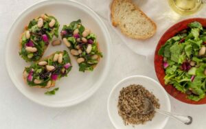 1. In a food processor, combine olive oil, garlic, and microgreens. Pulse until a chunky pesto forms. 2. Spread ricotta cheese on toasted bread. Top with pesto and season with salt and pepper.